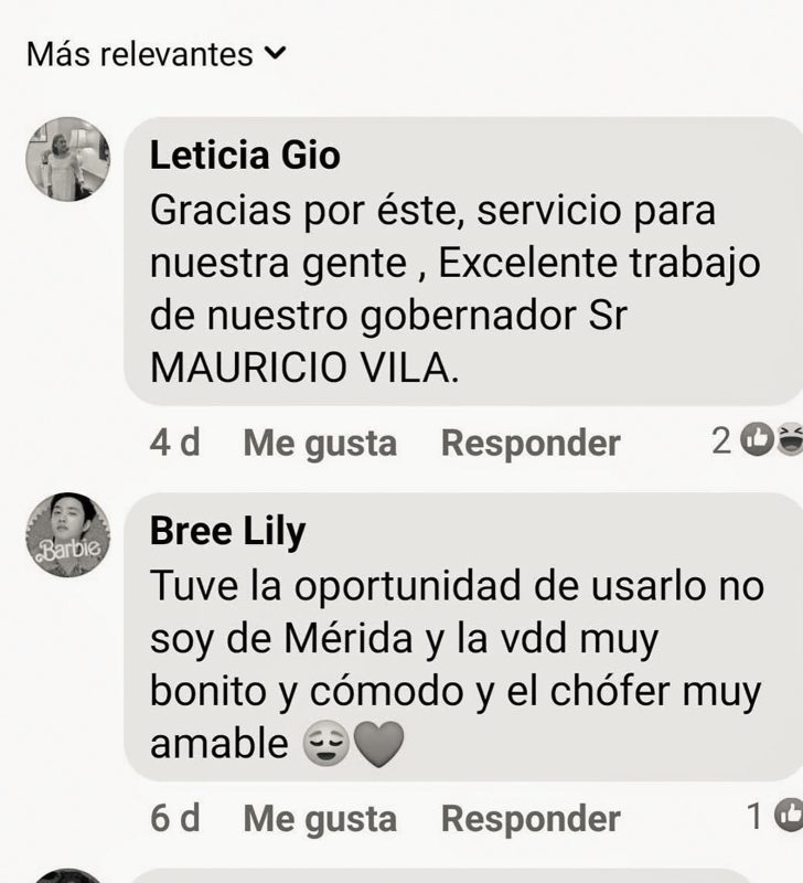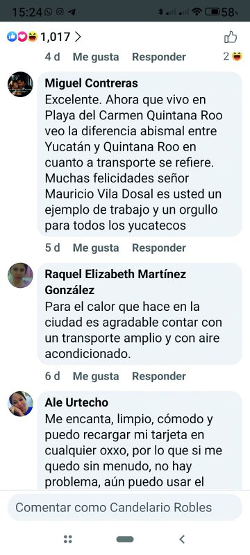 Usuario: Miguel Contreras Excelente. Ahora que vivo en Playa del Carmen Quintana Roo veo la diferencia abismal entre Yucatán y Quintana Roo en cuanto a transporte se refiere. Muchas felicidades señor Mauricio Vila Dosal es usted un ejemplo de trabajo y un orgullo para todos los yucatecos