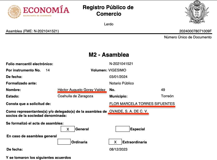 Está además Ovaide, fundada en Lerdo en 2013 por Felipe Méndez López, accionista, a su vez, de Global Intermex, y Victoria Hernández Martínez; a la que se integraron en 2021, como apoderados, Ana Karen Fierro Medina, Javier González Ruiz, y José de Jesús Orozco Escalera; además de Flor Marcela Torres Cifuentes, delegada especial de la sociedad.