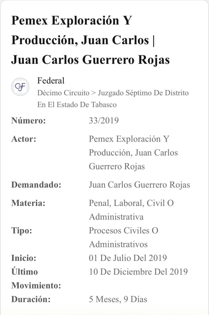 En registros documentales también aparece el nombre de Guerrero Rojas en un expediente donde Pemex Exploración y Producción lo señala en una demanda. El documento forma parte de expedientes vinculados a los convenios y contratos que se firmaron en ese periodo entre instituciones públicas y la empresa productiva del Estado.