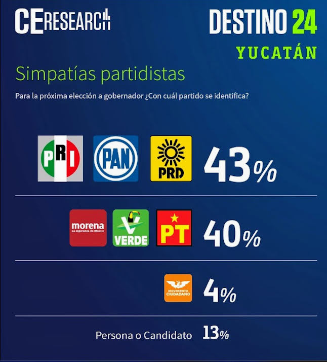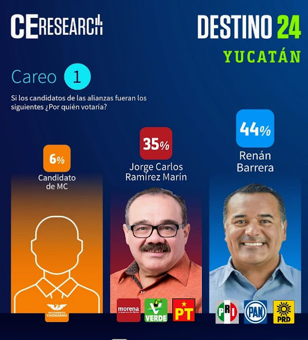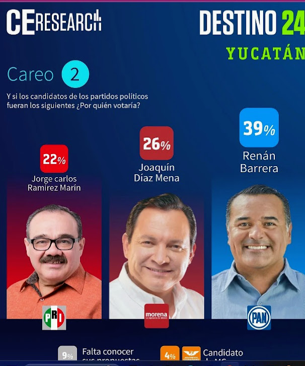 Durante el mes de octubre tres casas encuestadoras como CE-Research, Massive Caller y Pollsmx, han mostrado la preferencia electoral en Yucatán y Mérida, lo que refleja la confianza de los ciudadanos hacia las acciones del buen gobierno, humanitario y con crecimiento parejo demostrado por el Coordinador del Equipo Yucatán, Renán Barrera Concha, mediciones que lo colocan hasta con 20 puntos de ventaja sobre su más cercano competidor. Es Pollmx que coloca a Barrera Concha con una medición favorable 76.6% de las preferencias, mientras que, por Morena, Joaquín Díaz es el aspirante que mayor preferencia registra con 51.1%.