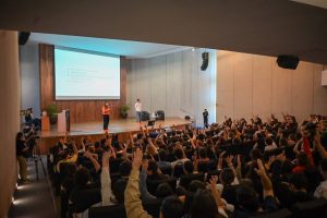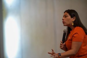 A la comunidad de la Universidad Marista la candidata naranja propuso terminar con el sistema de gobierno robusto.